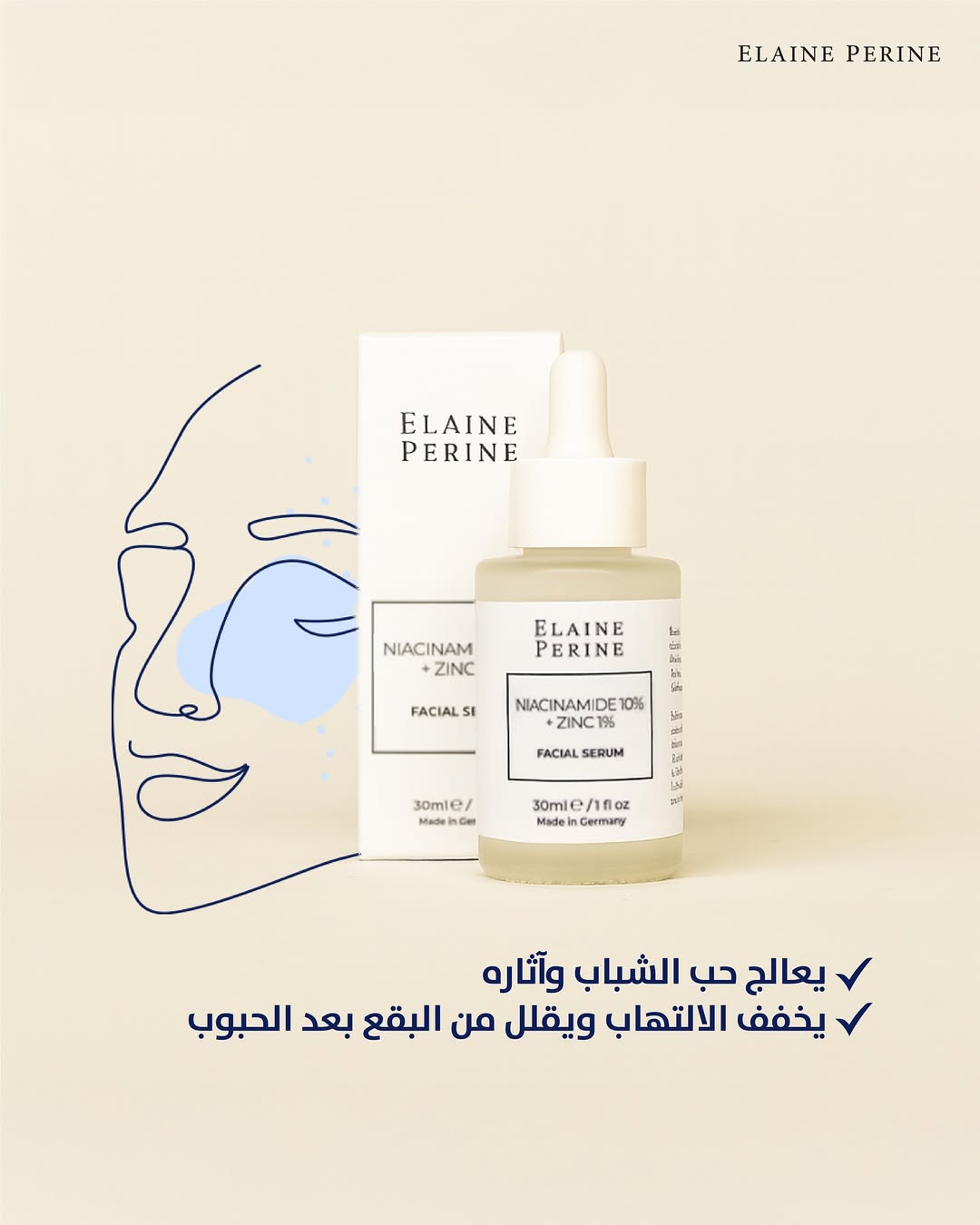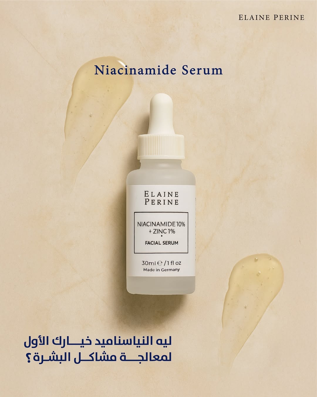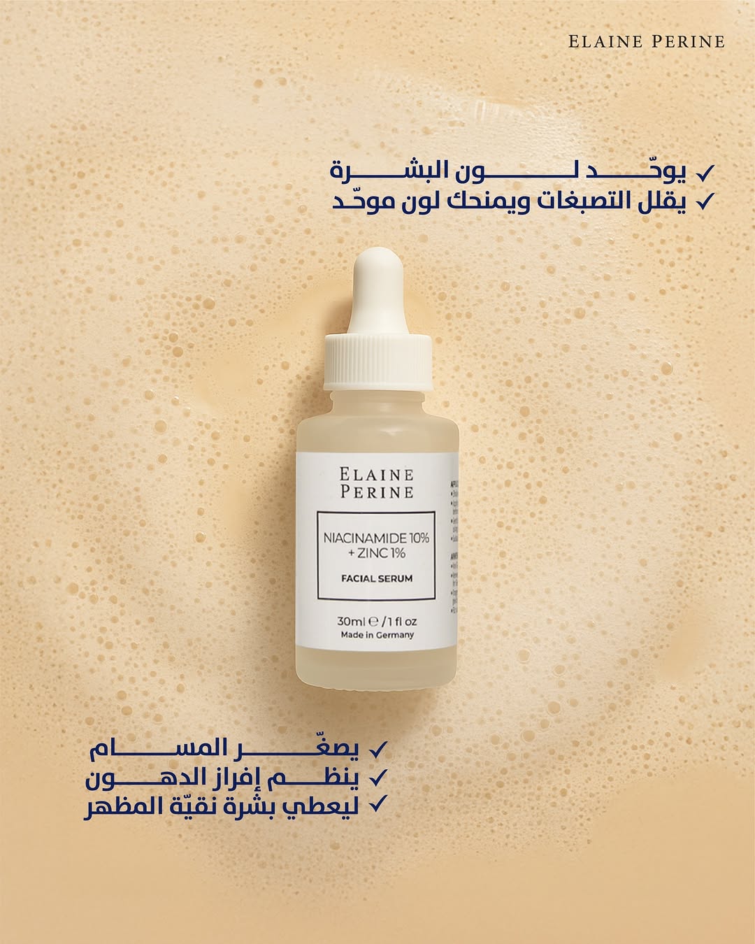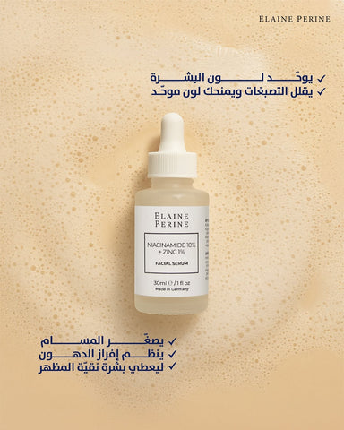سيروم Niacinamide + Zinc من Elaine Perine هو حل متعدد الفوائد يعمل على تصغير المسام، محاربة الحبوب، تفتيح التصبغات، وتقوية الحاجز الواقي للبشرة.